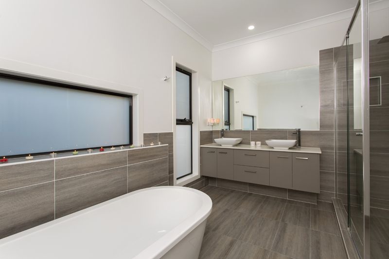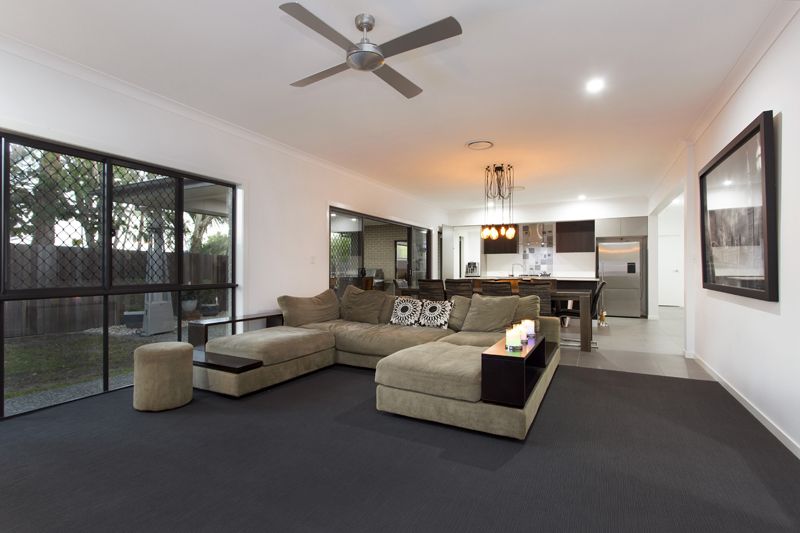 The layout boasts five bedrooms and two separate living areas, all on the one level. The bathrooms are finished with porcelain mosaic tiles and frameless glass shower screens. Throughout this home there is a sense of unrestricted light filled space, and subdued elegance.