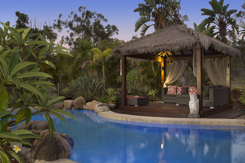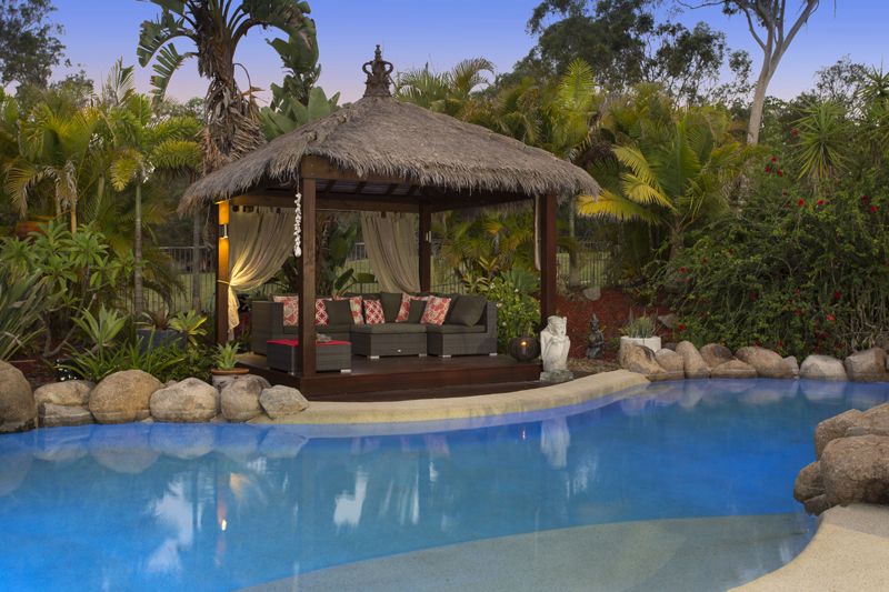 •Pool enclosure with rock fountain, Balinese Hut and exotic landscaping